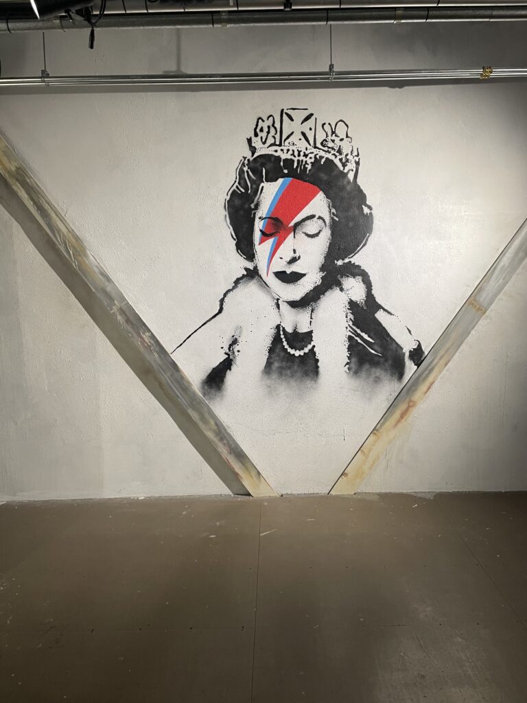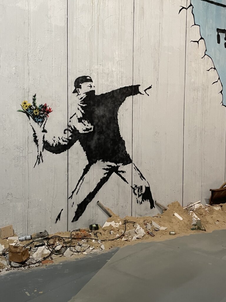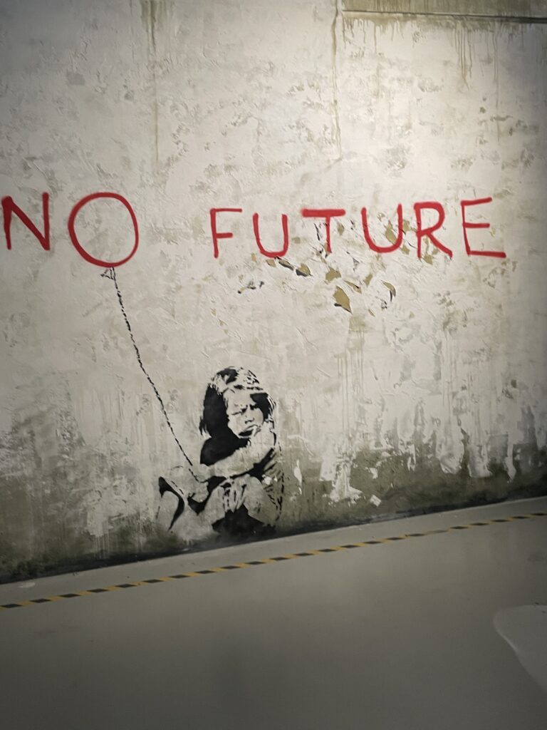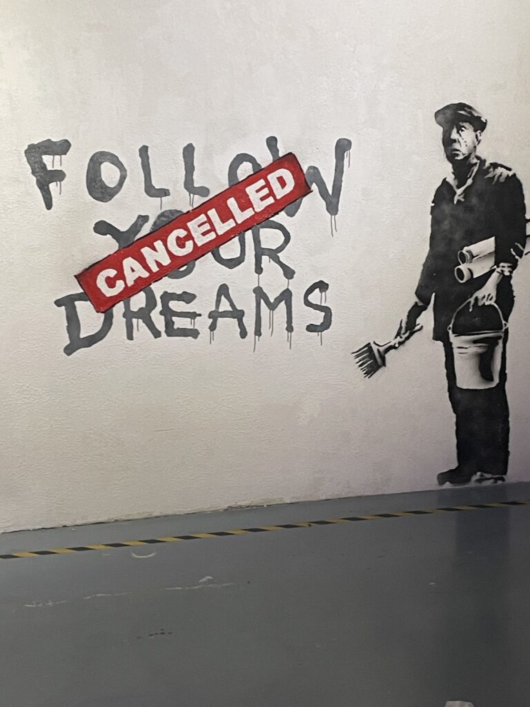 Maar Banksy is toch een graffity kunstenaar hoor ik u zeggen, hoe kun je dat nou tentoonstellen in een museum? Door het na te bootsen dus, zie de ronkende tekst van het Banksy museum zelf: