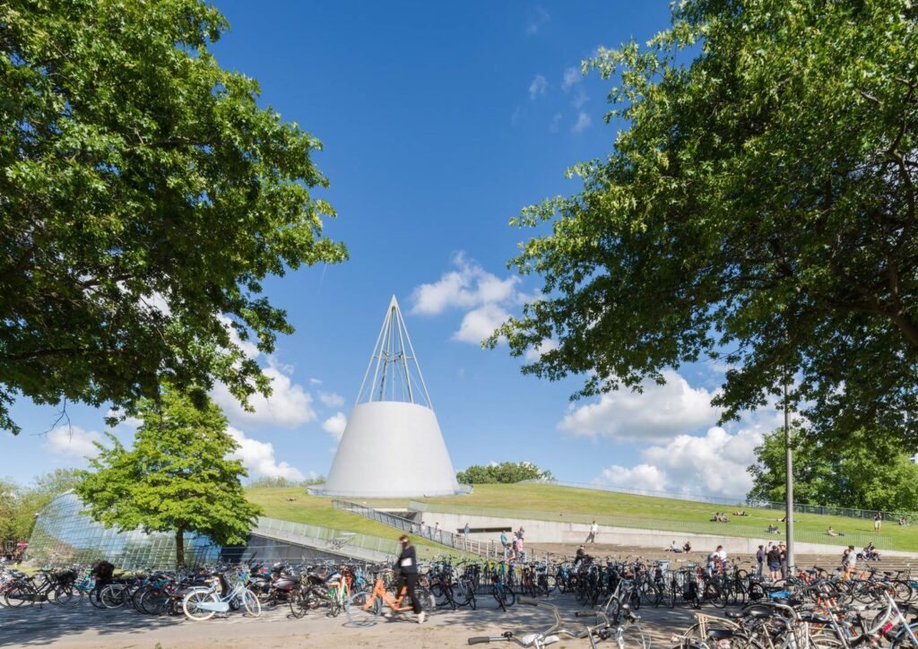 De kegel staat symbool voor techniek en geeft vorm aan de ronde leeszalen.